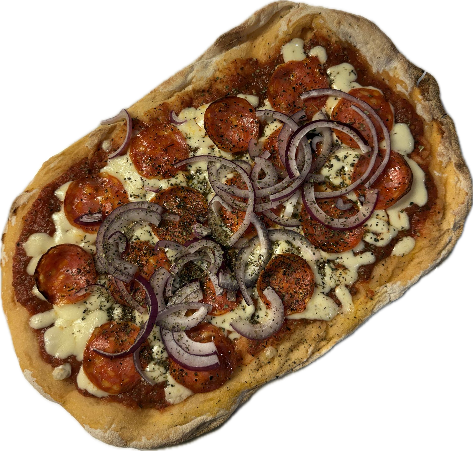 frische Tomaten Sugo, Mozzarella, Pikante Salami, Basilikum, Zwiebeln